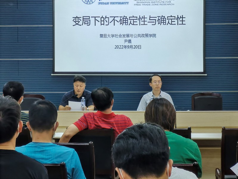2022年9月20日下午,乐鱼官网 党支部举办“学习贯彻习近平总书记“7·26”重要讲话精神” 党课学习活动,邀请复旦大学宣传贯彻习近平总书记“7.26”重要讲话精神理论宣讲团专家,社会发展与公共政策学院党委书记,上海自贸区综合研究院秘书长尹晨教授讲授“变局下的不确定性和确定性”。体教部党支部书记郭建忠主持会议,全体领导班子成员和党员参加会议。