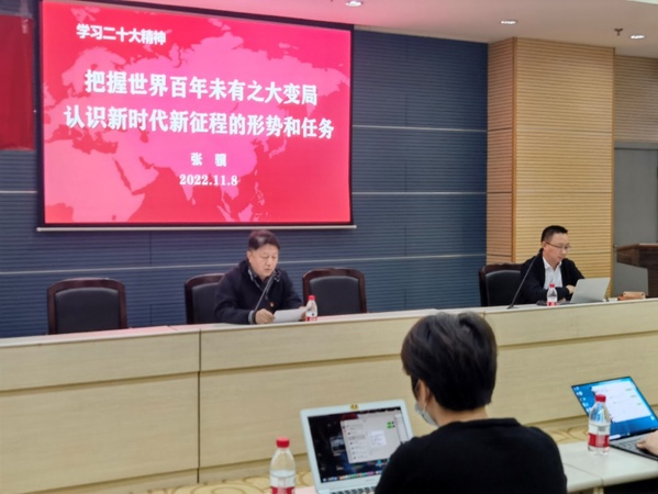 张骥教授从深刻认识党的二十大的重大意义、深入了解报告主要内容、牢牢把握过去五年工作和新时代十年伟大变革的重大意义、以中国式现代化全面推进中华民族伟大复兴的使命任务、把握世界百年未有之大变局、深入分析世界格局、坚定文化自信等方面,将报告与当前国际局势紧密结合,对党的二十大精神进行了系统深入讲解。宣讲进一步回答了牢牢把握新时代新征程的形势和任务,认识世界之变、积极应对挑战、坚定文化自信的意义和方式。